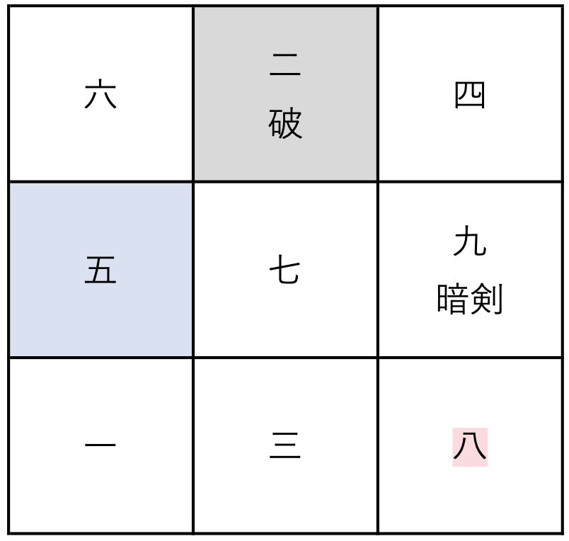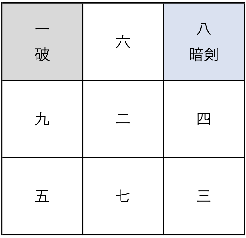 また後天定位盤にて一白の坎宮の対面に当たるので「定位対冲」とも言われる。「破れ」に近い運気低下の暗示。
